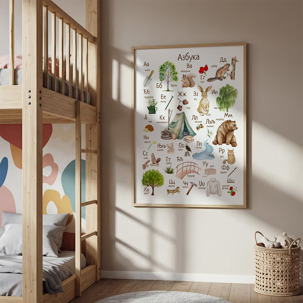 Azbuka za učenje slova na kreativan način! 🌿✨ Ilustrovana u prelepoj akvarel tehnici, ova edukativna slika inspiriše mališane da kroz igru i umetnost upoznaju slova. Dostupna u dve veličine, savršeno se uklapa u dečju sobu i podstiče učenje kroz vizuelnu estetiku i maštovite ilustracije. 📖🎨 Idealna za prve korake u svetu slova!
