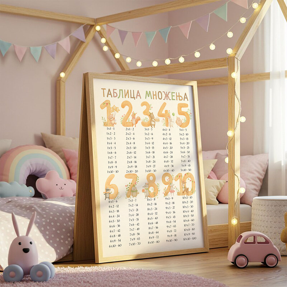 🐻Slatka i razigrana tablica množenja sa životinjicama🐻, osmišljena da deci učenje učini zabavnim i bliskim. Dostupna u dve dimenzije, sa ili bez rama – idealna za dečiju sobu, svakodnevno učenje i poklanjanje.