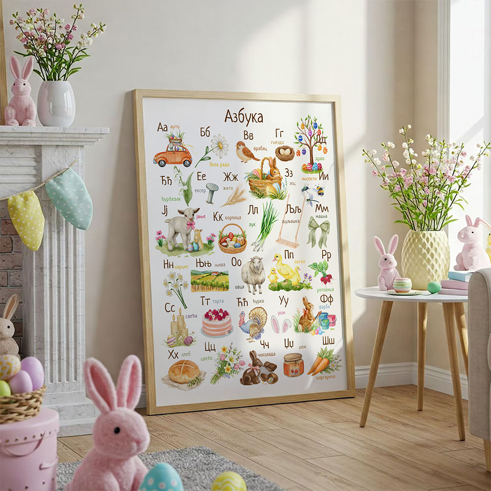 Vaskršnja azbuka je nežan edukativni poster koji kroz šarene praznične motive pomaže deci da upoznaju slova na zabavan način. Poster je moguće personalizovati imenom deteta i savršeno se uklapa u prolećnu dekoraciju dečje sobe.